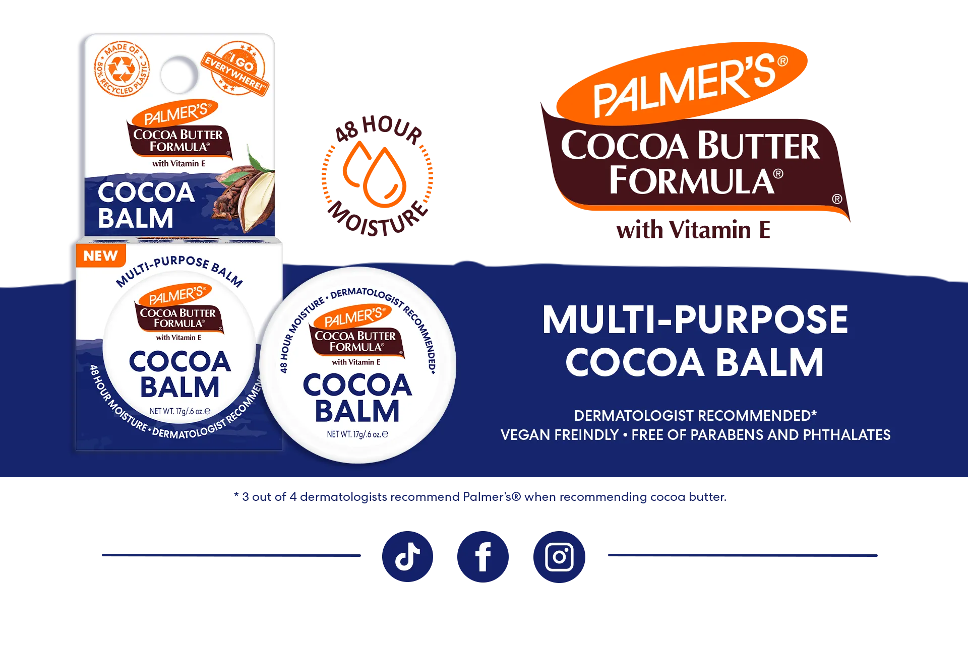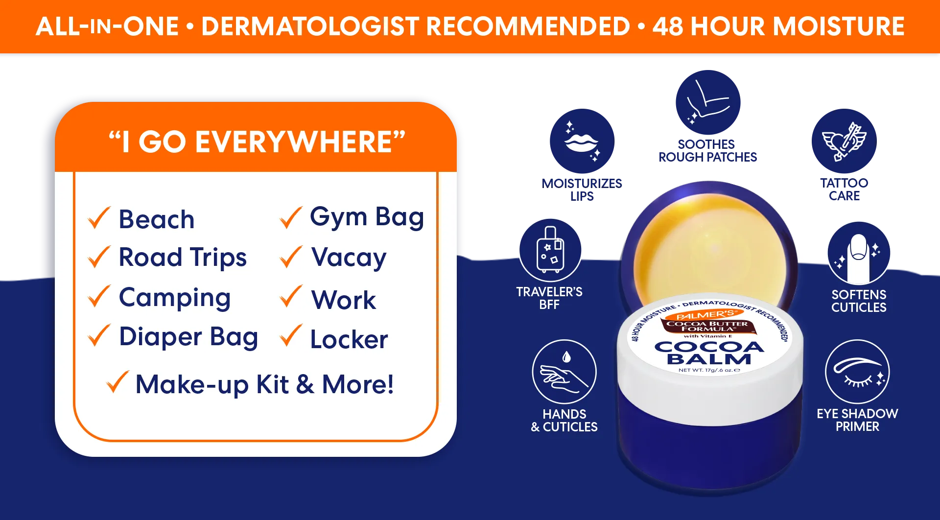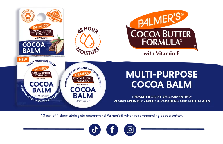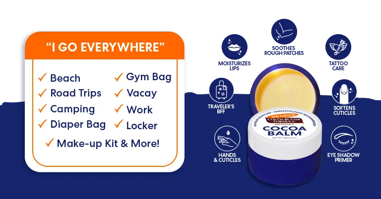 Unit price / perPalmer's "I go everywhere!" Cocoa Balm heals, moisturizes and repairs from head-to-toe. Crafted with rich Cocoa Butter and Vitamin E, this versatile balm is perfect for everything from moisturizing lips, cuticles, and rough patches, to taming flyaways and caring for tattoos. The perfectly portable size makes it the ideal beauty go-to balm for travel, gym, backpacks and all your on-the-go adventures!